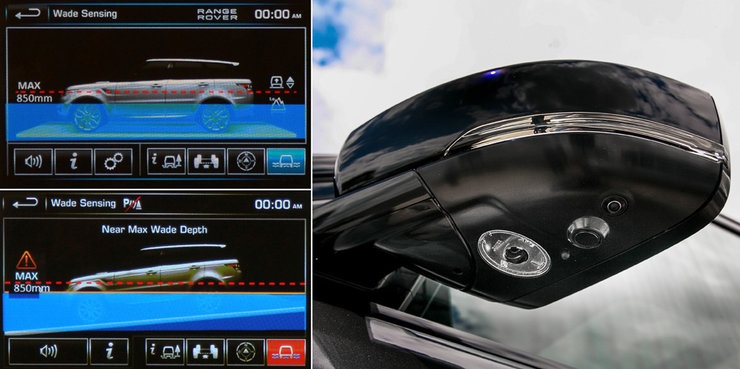 Максимальный клиренс нового Range Rover Sport — 278 мм (ранее было 227 мм). Ход подвески — 546 мм. Преодолеваемый брод — 850 мм — на 50 мм меньше, чем у обычного Рейнджа, и на 150 мм больше, чем у модели предыдущего поколения. Но как определить глубину? На RSS — очень просто — ни палка, ни забродники не нужны. Уровень воды сканируется при помощи ультразвуковых датчиков (аналогичные используются в парктрониках), встроенных в нижнюю часть корпусов боковых зеркал (здесь же камера системы кругового обзора и диодный фонарь, подсвечивающий подступы к автомобилю). Фактический уровень воды относительно «ватерлинии» демонстрируется в наглядном «мультике» на центральном мониторе. Система работоспособна при углах наклона до 10о, она автоматически отключается, если идти вброд со скоростью выше 30 км/ч более 30 секунд